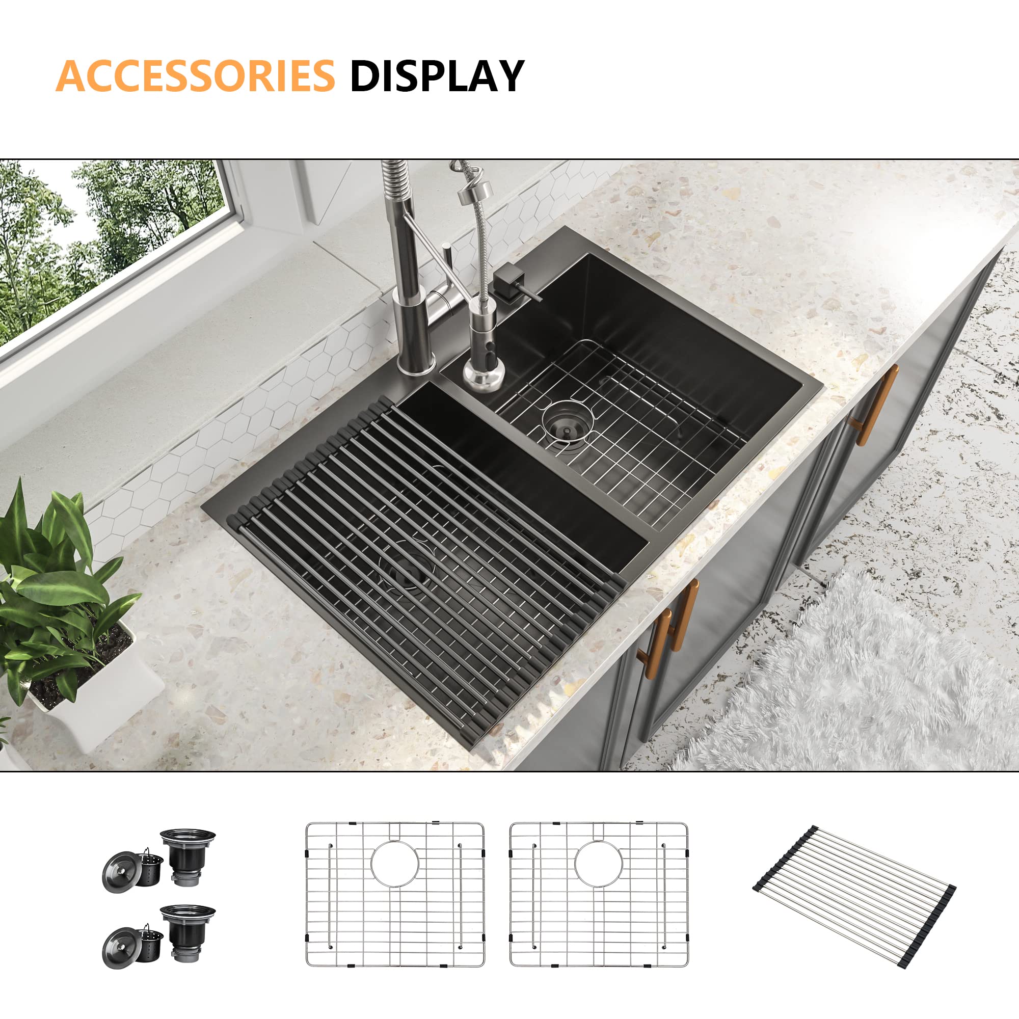 - [Size Description] – The black double bowl kitchen sink measures 22″(D) x 33″(W) x 9″(H) and fits the smallest cabinet size of 36″ with standard 3.5″ drainage holes for faster and more efficient drainage. [Package Included] – drain strainer, roll up drying rack and bottom rinse grid.